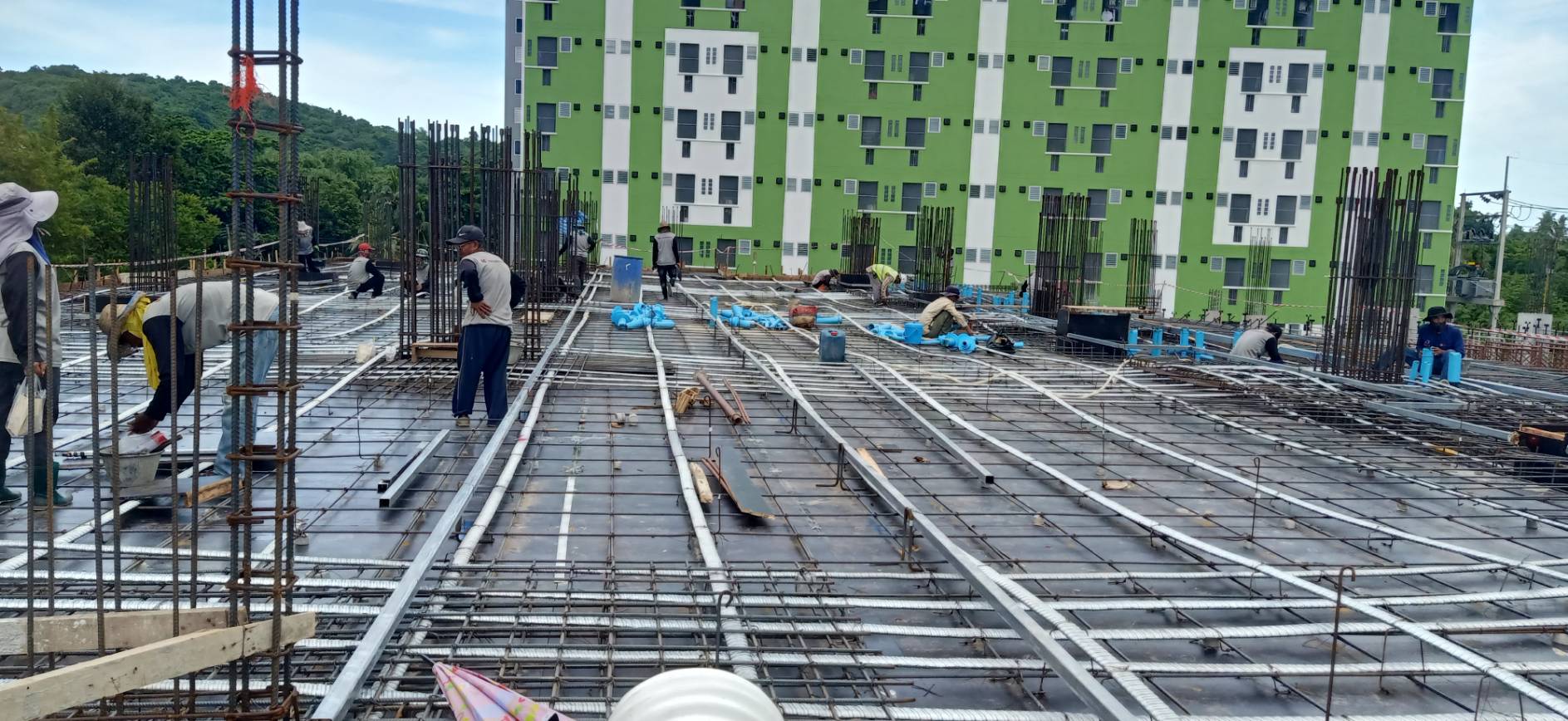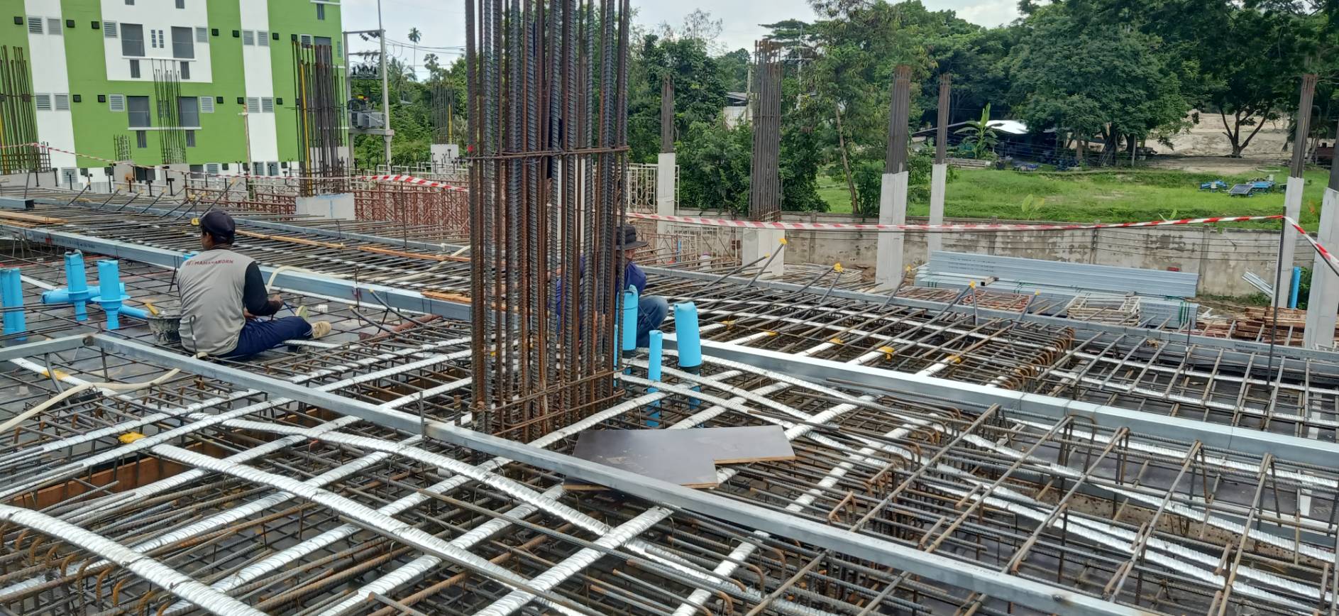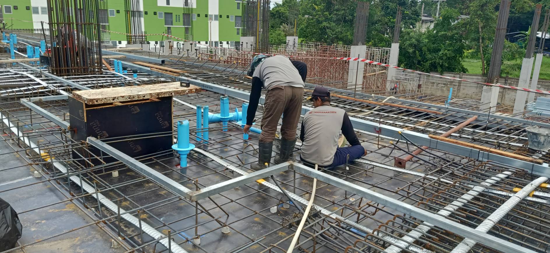 -ดำเนินการผูกเหล็กเสริมชั้นต่ำสำหรับแป้นหัวเสา (DROP PANEL) แล้วเสร็จ
